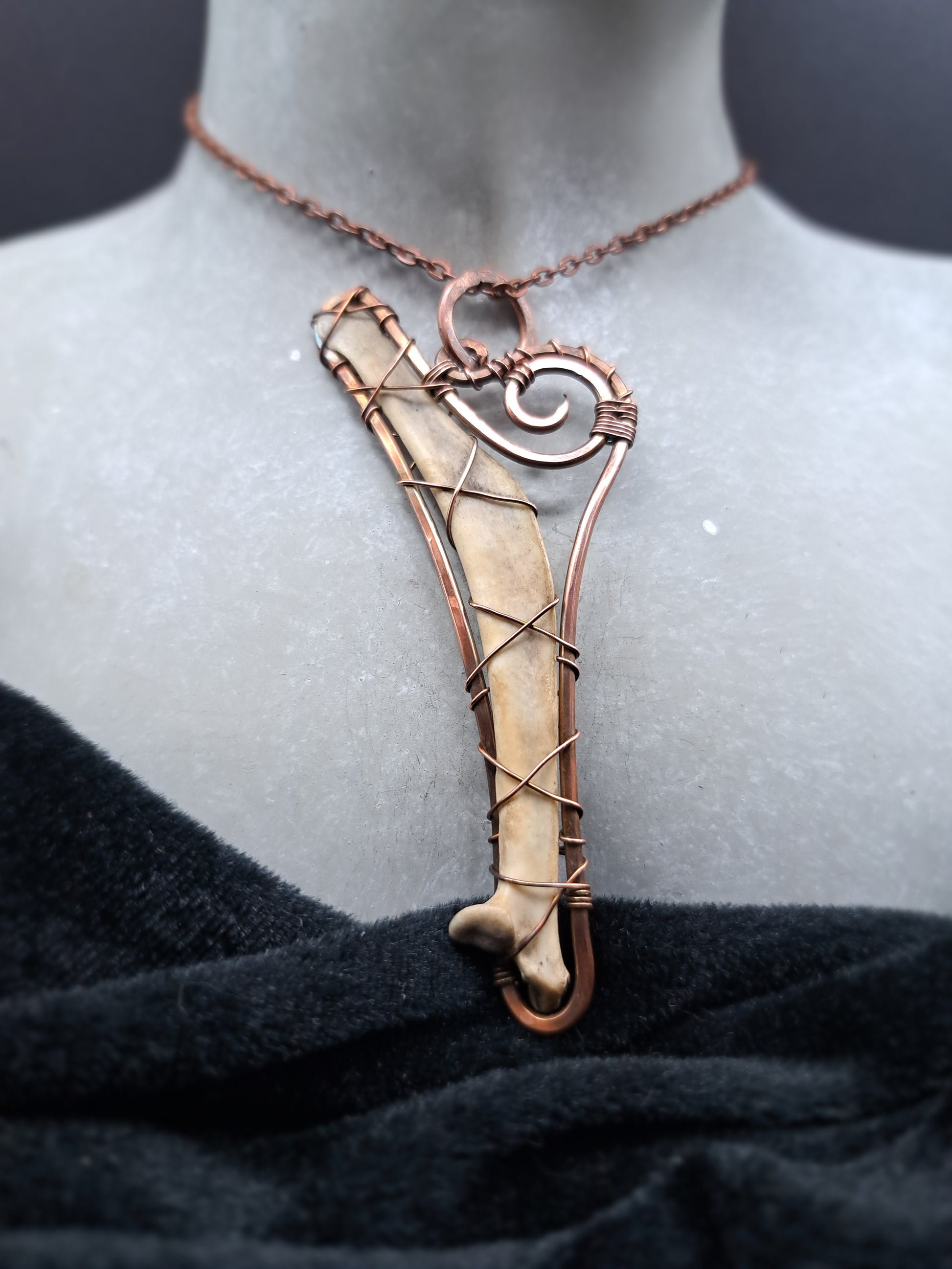 In diesem Anhänger lebt seine Kraft weiter: Der Fasanenknochen ruht in einer kupfernen Fassung, die selbst an einen Knochen erinnert – wie ein kleines Schutzgehäuse, das den Geist des Vogels bewahrt. Kupfer verleiht Wärme, Lebensenergie und Erdung, während die Form den natürlichen Rhythmus der Knochen widerspiegelt. So entsteht ein Amulett, das wie ein wachsames Auge an deiner Seite wacht.