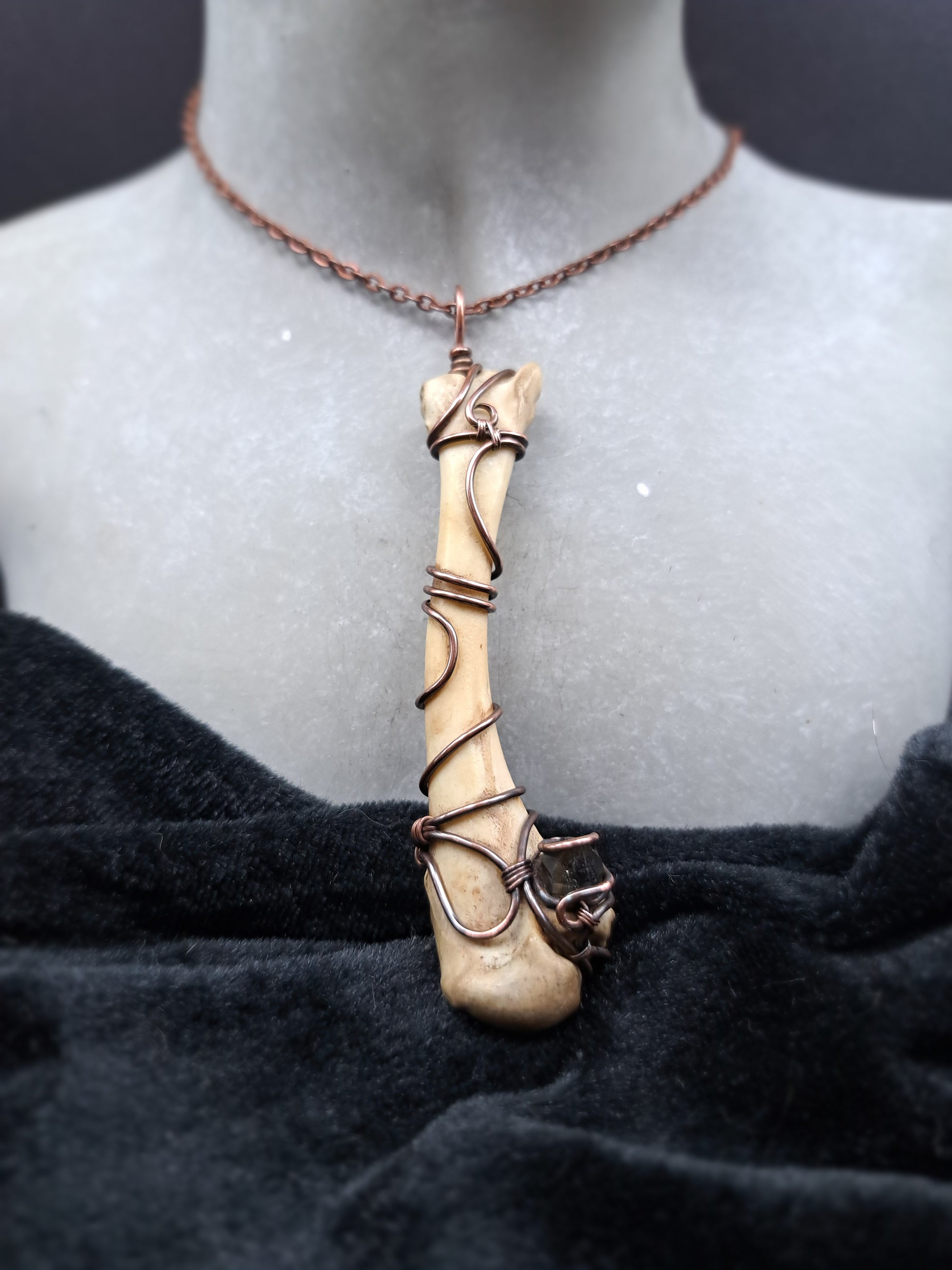 Der Fasanenknochen trägt diese uralte Energie in sich. Kombiniert mit einem Herkimerdiamanten, der als „Leuchtstein“ gilt, entsteht ein Schmuckstück von seltener Kraft: Der Diamant wirkt wie ein inneres Licht, das den Pfad weist und Klarheit in Entscheidungen bringt. Die Kupferfassung verbindet die Kraft des Fasanen mit der strahlenden Intuition des Diamanten und verleiht dem Talisman Wärme, Vitalität und Erdung.