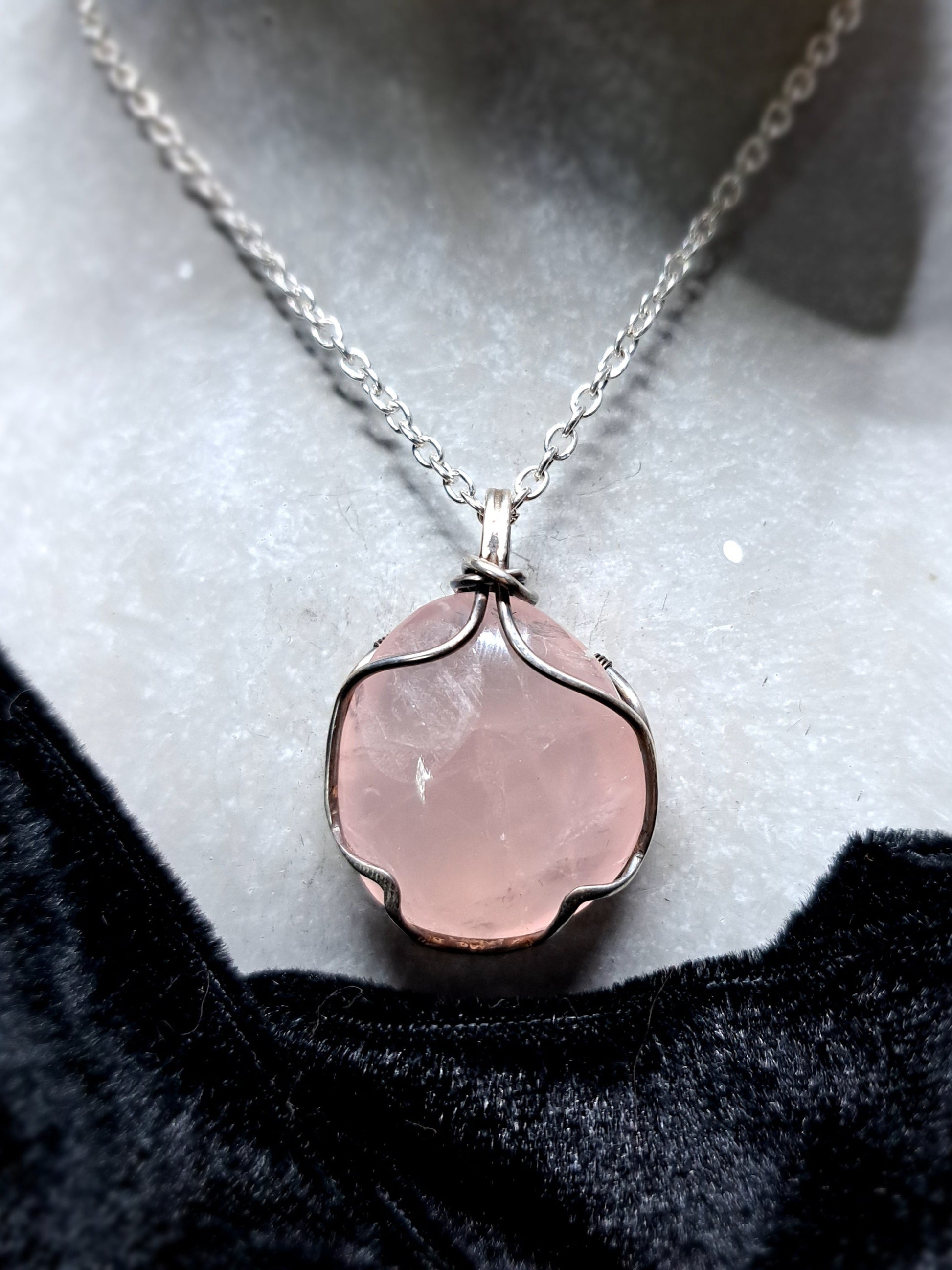 Die Silberfassung intensiviert diese Wirkung, indem sie die Intuition und die emotionale Tiefe verstärkt. Zusammen bilden Rosenquarz und Silber ein Amulett, das Herz und Seele verbindet – ein Symbol für Liebe, Sanftmut und Heilung.