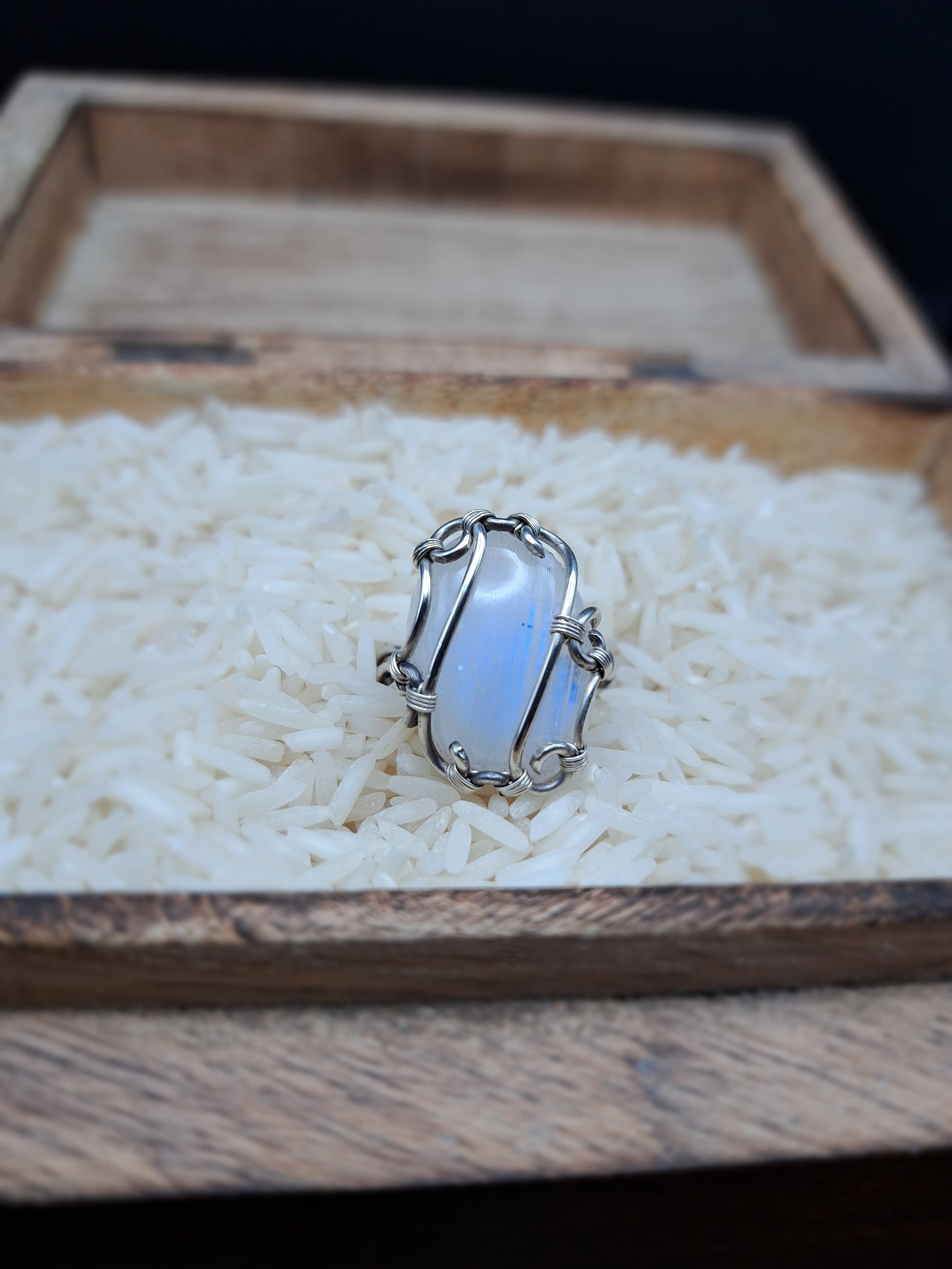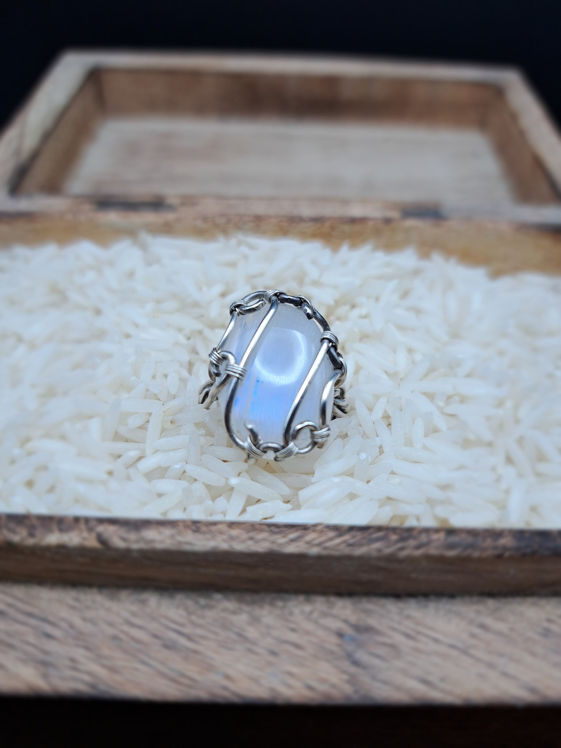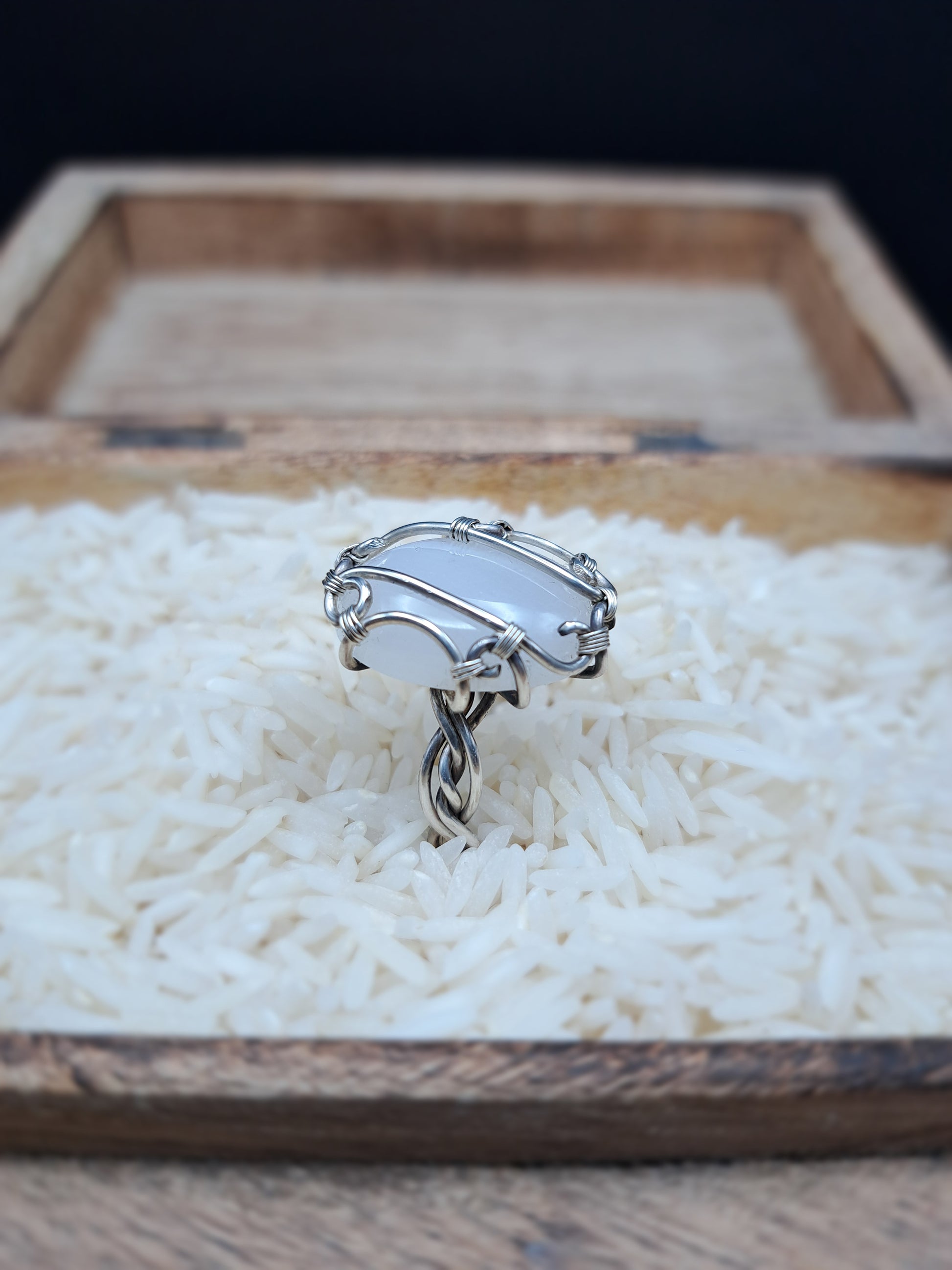 Das Silber, das ihn hält, spiegelt diese Sanftheit. Es ist das Metall des Mondes, der Weiblichkeit, der Heilung. Gemeinsam erschaffen sie ein Bild stiller Kraft – ein Kreis aus Licht und Klarheit, ein Versprechen an dich selbst, nie zu vergessen, wer du bist.